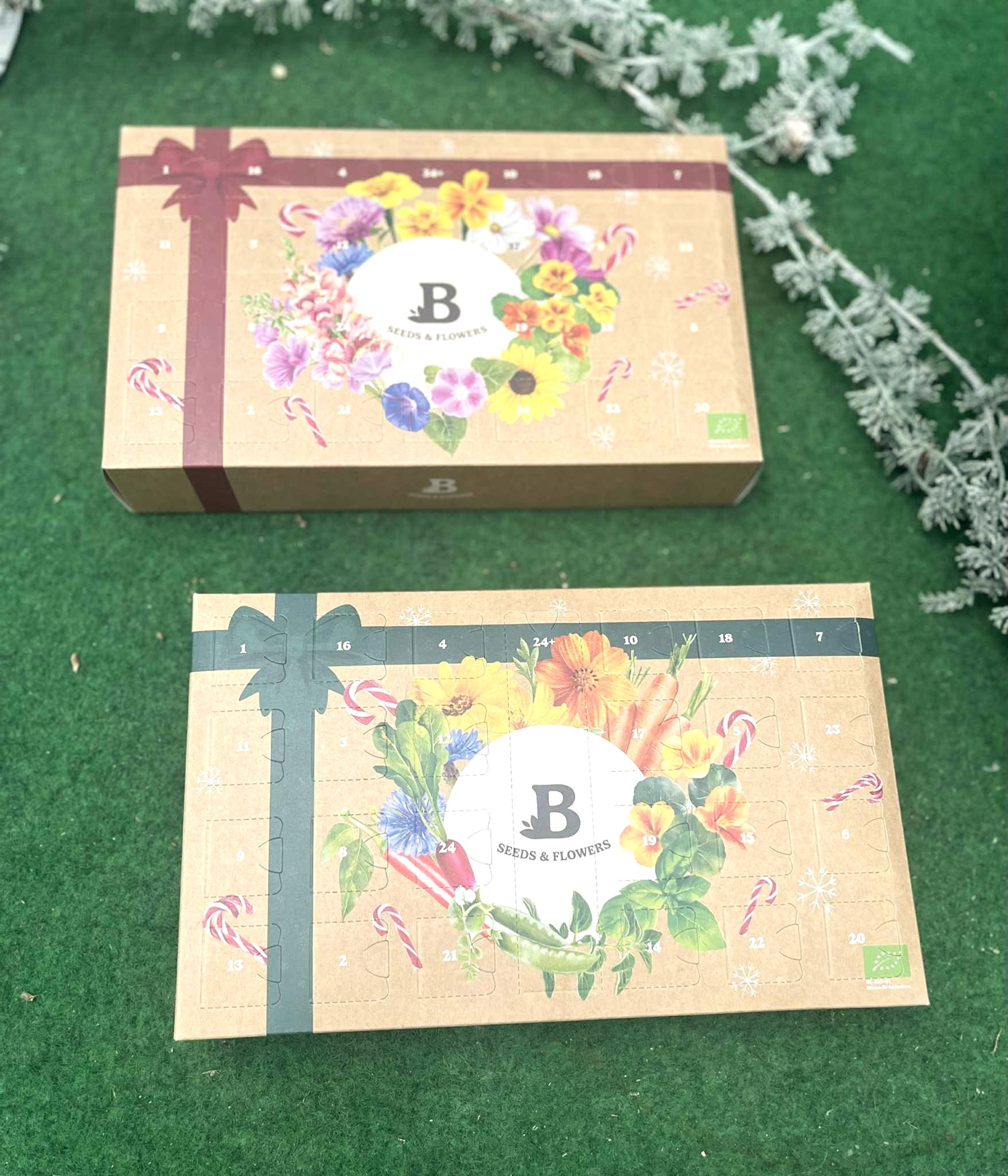 1 stk. frø - julekalender (24 låg) med et blandet udvalg af grøntsager, krydderurter og blomster.