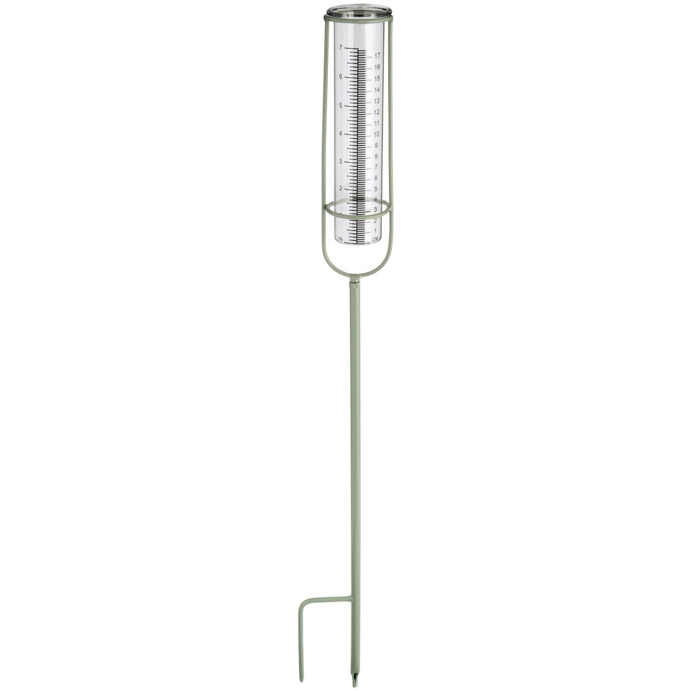 Regnmåler i klart plast monteret på jordspyd og placeret i haven mellem grønne planter. Den gennemsigtige måleskala gør det nemt at aflæse nedbørsmængden og følge med i, hvor meget regn haven har fået. Et enkelt og funktionelt haveredskab til både køkkenhave og prydhave.