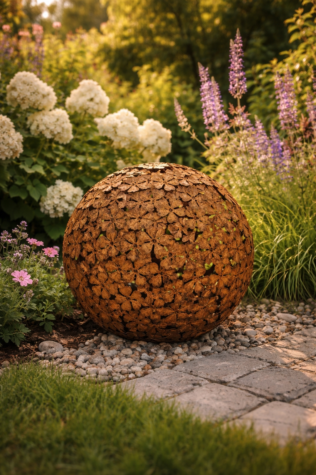 Giv din have et råt og romantisk udtryk med denne dekorative hortensiakugle i rust. Kuglen er fremstillet i jern og designet med små, udskårne blomster inspireret af hortensiaens frodige blomsterstande. Med sin varme rustfarve passer den perfekt ind i havens naturlige omgivelser og tilfører et kunstnerisk præg.