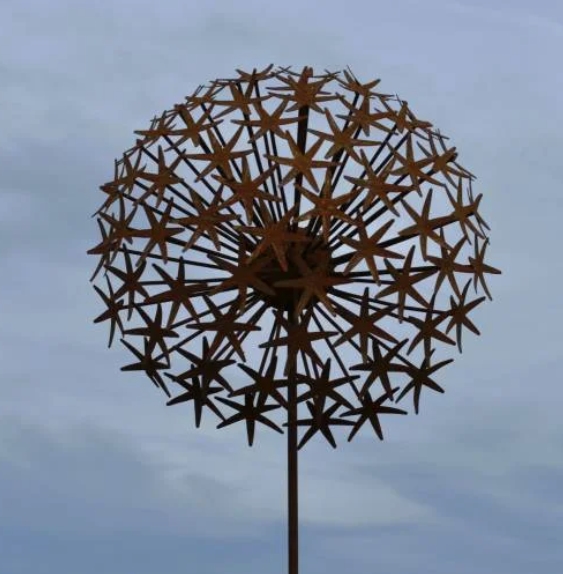 Giv din have et kunstnerisk og naturligt udtryk med denne imponerende mælkebøtteskulptur i rusten jern.