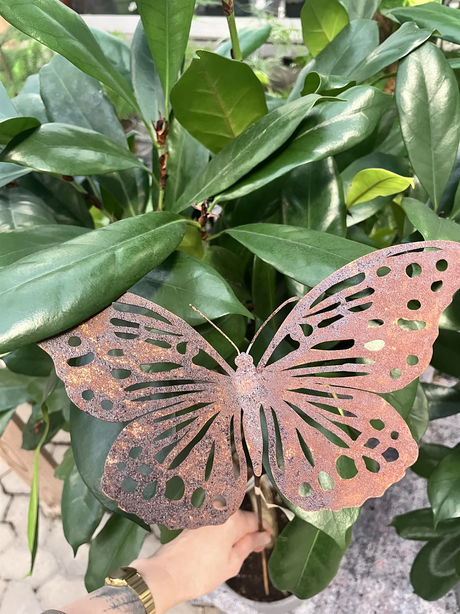 Dekorativ sommerfugl i rustet metal med fine udskæringer, der giver et let og naturligt udtryk i haven eller i krukker.