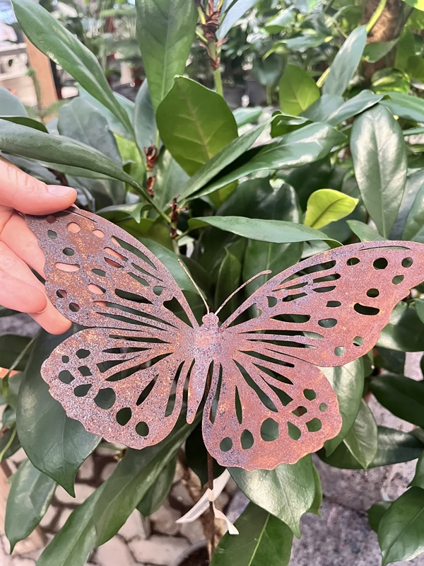Den varme rustpatina spiller flot sammen med grønne blade og blomster og tilfører struktur året rundt – også når haven ikke blomstrer. Sommerfuglen er fastgjort til en metalpind, så den nemt kan stikkes direkte i krukker, bede eller altankasser.