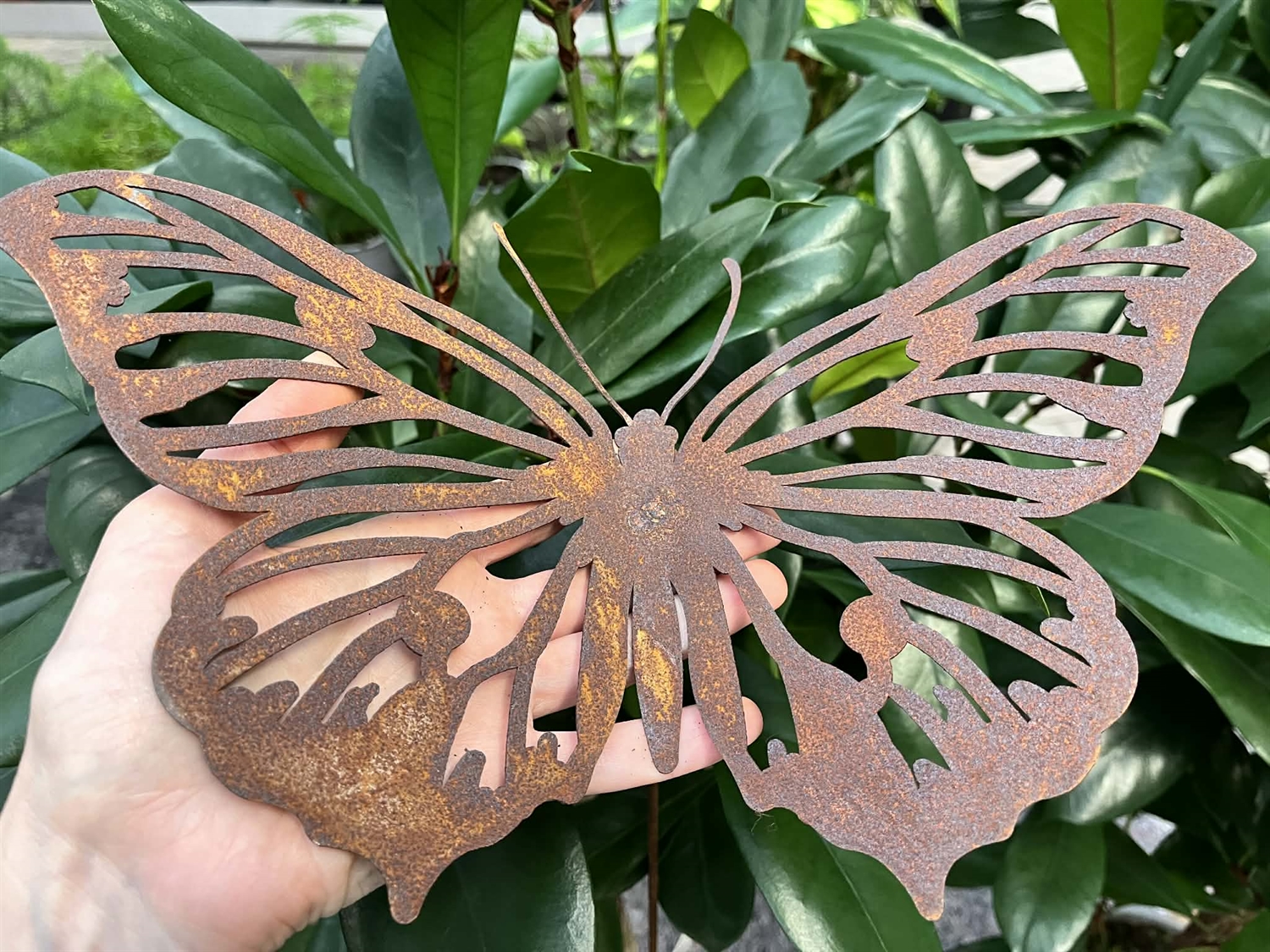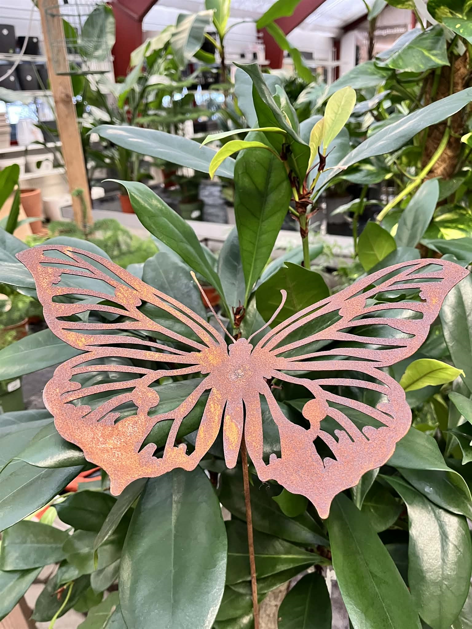 Dekorativ sommerfugl i rustet metal med elegante, detaljerede udskæringer, der skaber et let og dekorativt udtryk i haven eller i krukker. Den varme rustpatina fremhæver de fine vingedetaljer og står flot mod grønne planter og blomster. En stemningsfuld havedekoration, der giver struktur og liv – også uden for blomstringssæsonen. Sommerfuglen er fastgjort til en solid metalpind og kan nemt stikkes direkte i jord, krukker eller bede.