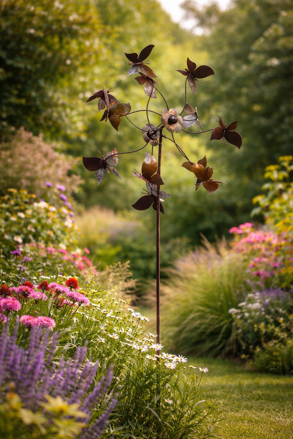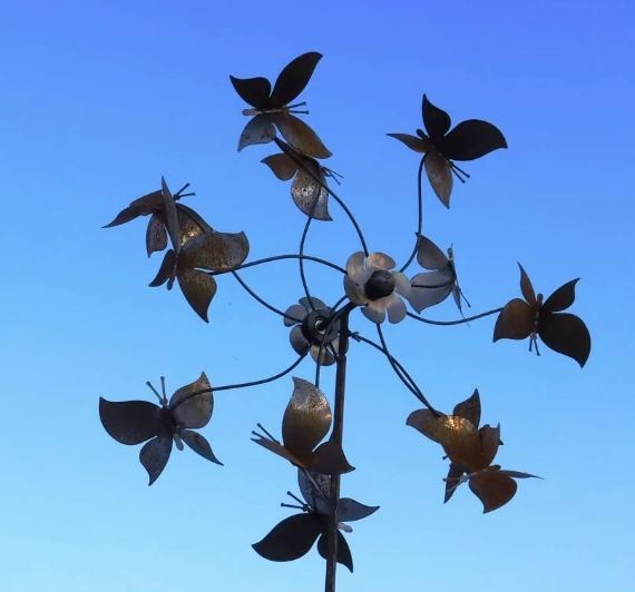 Dekorativ sommerfugle-spinner i jern fra Danas Have. En høj havespinner, der skaber bevægelse og liv i haven, når vinden blæser B 30 cm, D 70 cm,, H 230 cm.