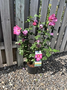 Syrisk rose (Hibiscus `Woodbridge`)  Mellemstor, stivgrenet busk med opret vækst. Sent løvspring med mindre, matgrønne blade. Store cheriserøde blomster i sen-sommeren med dybrød midte. Dekorative frøstande. Solrig og lun vokseplads i en veldrænet, næringsrig muld. Sælges i 5 liter potte.