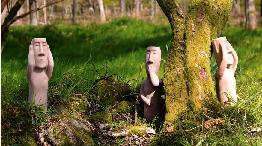 Tre karakterfulde terracotta figurer, inspireret af det klassiske "Se ikke, hør ikke, sig ikke"-motiv.